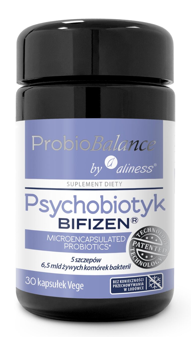 ProbioBalance Psychobiotyk BIFIZEN® to suplement diety zawierający opatentowaną kompozycję szczepów probiotycznych BIFIZEN®, przebadaną pod kątem wpływu na równowagę mikrobiologiczną jelit oraz samopoczucie psychiczne i jakość snu.